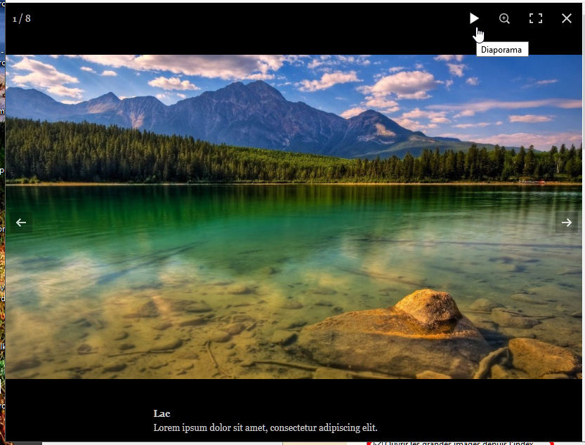 Vos images s'afficheront dans un mode pleine page avec la possibilité d'utiliser le diaporama défilant et en plein écran si le visiteur le souhaite. Vous verrez sur le forum que l'on parle souvent du diaporama PhotoSwipe.