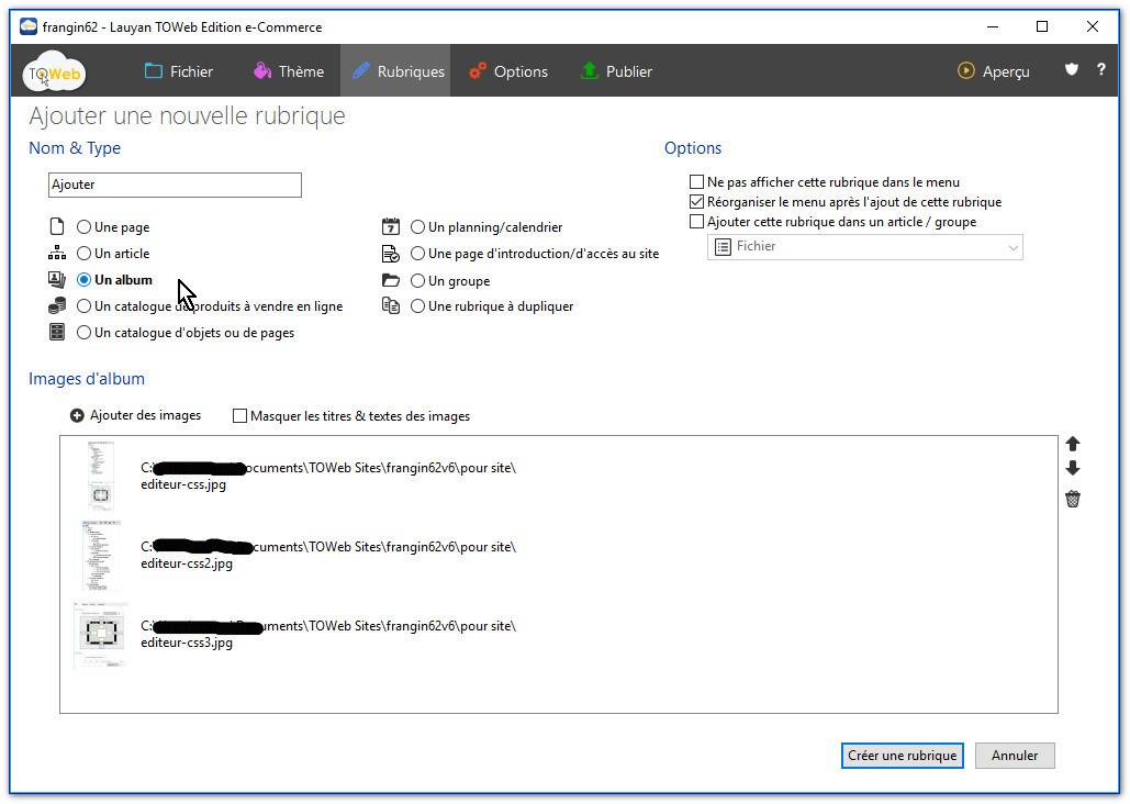 Si vous créer plusieurs albums suivant des thèmes différents et que vous voulez appliquer une couleur différente, dans ce cas vous ne copiez pas les scripts dans Section <HEAD> mais dans le Head de chaque rubrique/album en changeant votre couleur. Ceci est applicable également si vous voulez changer le texte en fonction de votre thème,