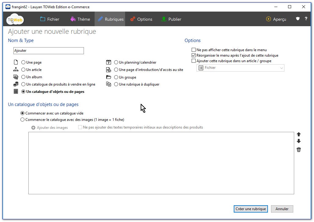 Lors de la création d' Un catalogue d'objets ou de pages, nous retrouvons toujours la même entête du formulaire.