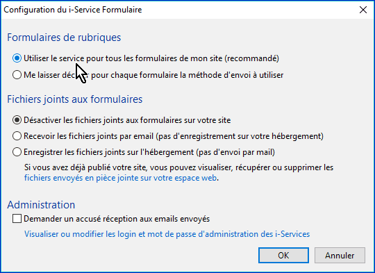, vous ouvrez cette fenêtre dans laquelle vous donnerez différentes indications. "Utiliser le i-service Formulaire" est sélectionné par défaut. Vous pouvez modifier la position des libellés et texte d'aide que vous avez mis en créant les champs.