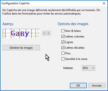 Pour ajouter un code de sécurité pour l'envoi du mail, utile pour bloquer les robots spammeurs (ceux qui chargent votre messagerie inutilement), allez dans Options --> Sécurité et HTML et cochez "Ajouter des codes de vérification...." puis cliquez sur "aide & configuration captcha", validez les options suivant ce que vous voulez, puis "Générer les images"