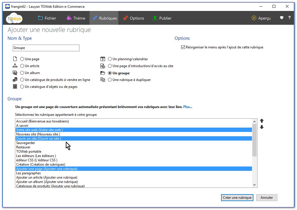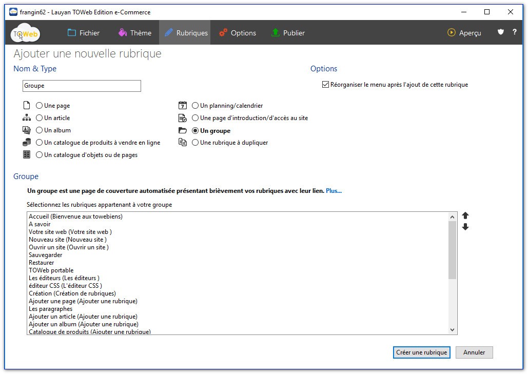 Un groupe est un ensemble de rubriques dont l'accès est géré par des liens particuliers créé par TOWeb.