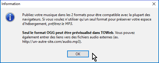 Les formats à utiliser sont le MP3 et/ou le OGG. C'est ce dernier qui permet d'écouter la musique lors de la création du paragraphe. Vous devez éventuellement convertir vos fichiers si nécessaire.
