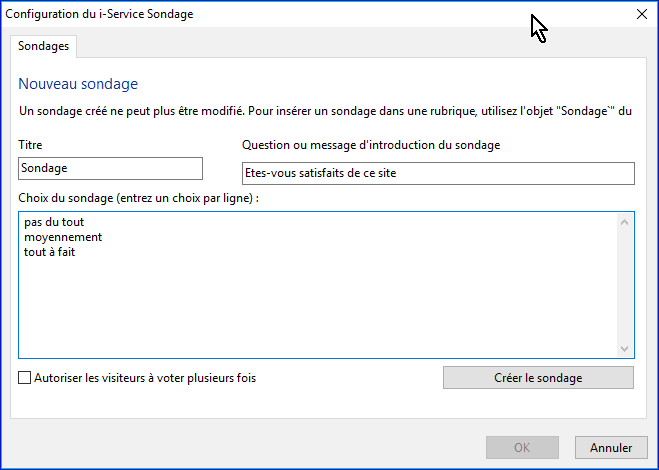 Vous avez donc ce deuxième formulaire dans lequel vous voyez un récapitulatif et avez la possibilité de modifier certaines options dans l'onglet "Sondages". Si vous avez autorisé le visiteur à voter plusieurs fois dans le premier formulaire, contrôler ici que la case est toujours cochée.