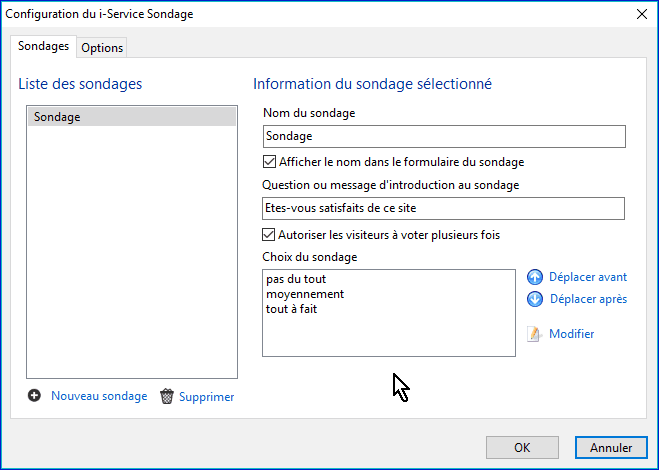 Il est possible de créer un nouveau sondage ou d'en supprimer un.