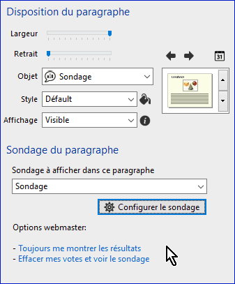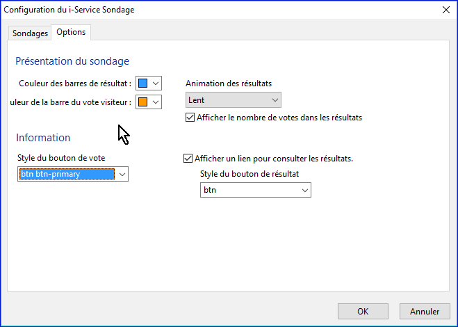 Dans l'onglet "Options", vous modifiez la présentation de votre sondage sur la page Web. Evidemment vous pouvez y revenir si le rendu ne vous satisfait pas.