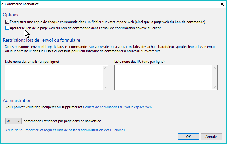 Le back-office de TOWeb permet de visualiser les bons de commandes en ligne stockés dans le répertoire /i_serv/twsc/data/ sur votre hébergement. Pour cela vous devez sélectionner la premiére case "Enregistrer une copie....".