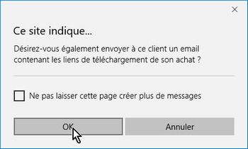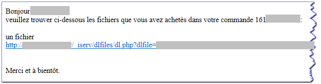Si tout est correcte dans les indications de la commande, cliquez sur OK, vous envoyez de ce fait le mail avec le lien de téléchargement à votre client. Comme indiqué dans l'aide de Lauyan, ce lien est personnel en relation unique avec le bon de commande. Chaque client aura son lien personnalisé.