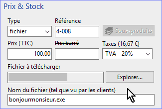 Dans la page de votre boutique concernée par le document, vous sélectionnez le type "fichier". Instantanément, le formulaire "Prix et Stock" va se modifier et la page de recherche sur votre PC va s'ouvrir. Vous pouvez bien sûr modifier par la suite le lien dans "Explorer..." en cas de mise à jour du fichier et donner un nom éventuellement plus explicite pour le client (l'extension (ici .exe) n'est pas modifiable).