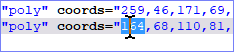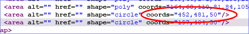 Pour les cercles, vous récupérez les 3 valeurs de coords dans 'coords="452,481,50" ' ,