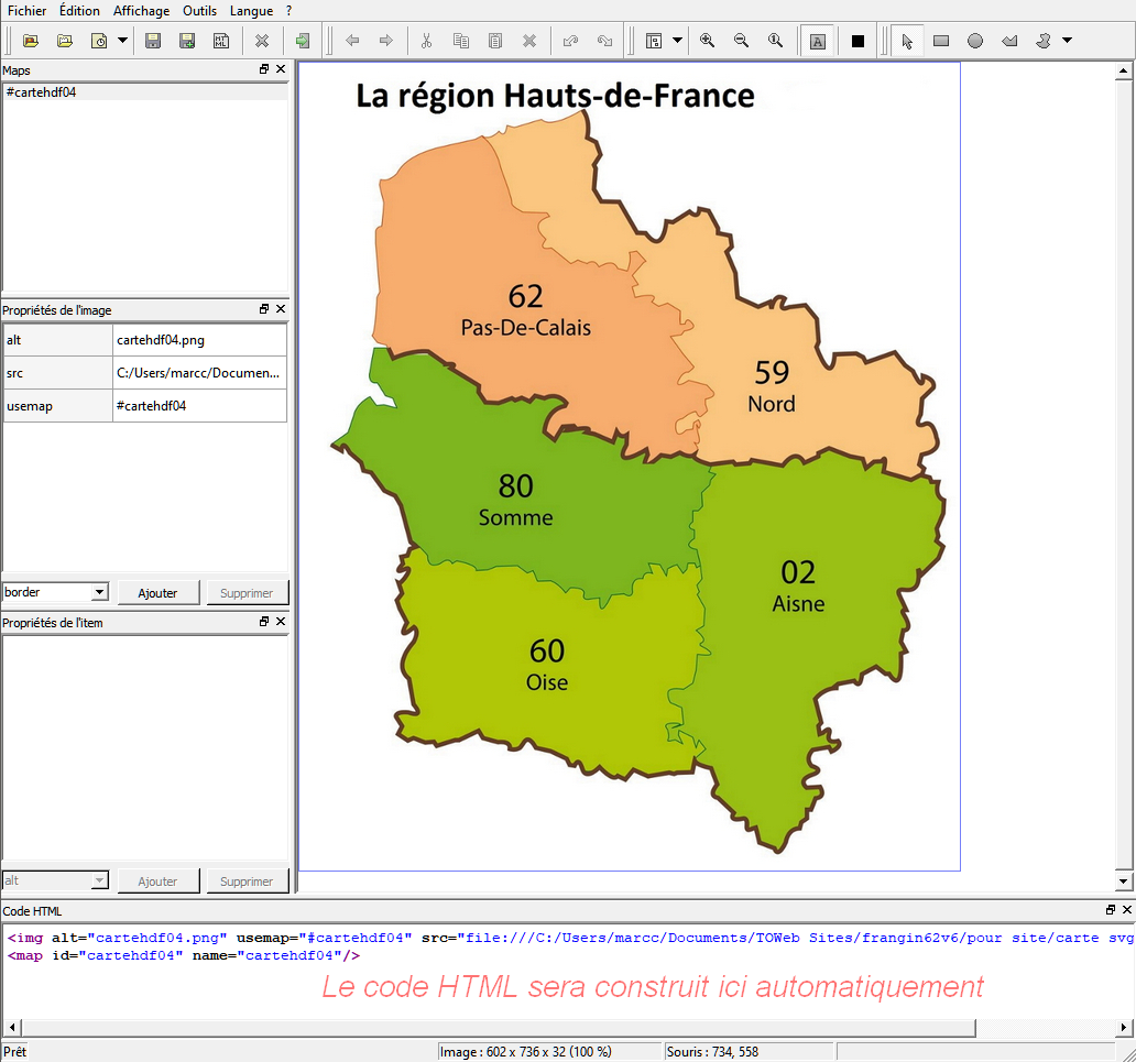 Comment créer assez facilement une carte cliquable mais surtout qu'elle soir reponsive. Pour le tuto, j'ai utilisé une carte de 602 x 736 px, mais d'autres tailles fonctionnent évidemment. Bien sûr, ce tuto peut s'appliquer pour tout type d'images, cartes géographiques, plans de maisons ... et tout et tout, et même pour des sites créés avec autre chose que TOWeb.