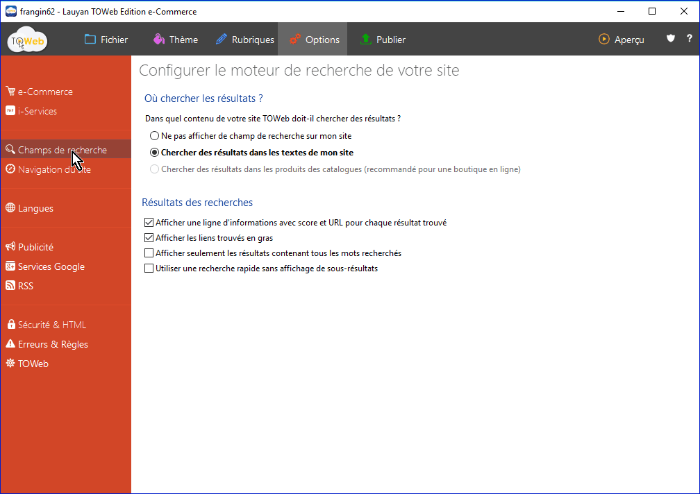 Si vous voulez utiliser le champ de recherche, vous devez le configurer dans les Options ainsi que dans le thème.