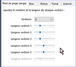 Lors de la création de votre site, il va falloir libérer le petit pied de page, pour cela, vous allez dans Thème/CSS, cliquez sur Pied de page (large), vous ajoutez 2 sections (dans le standard, il y en a 3, donc vous mettez 5), puis vous redimensionnez la 4ième et la 5ième à 50% de la largeur (affiche 6 sous le curseur).