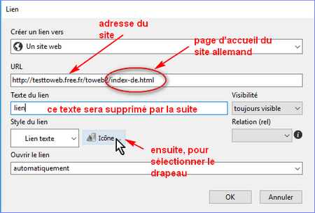 Après le clic sur Icône... faites comme pour l'image du drapeau français. Après la validation de l'ensemble, le 2nd drapeau sera en place, il n'apparaît qu'à ce moment. Avec la touche Retour arrière du clavier, effacer le mot " lien " qui suit l'image (uniquement lui, sinon vous effacez tout et on recommence).