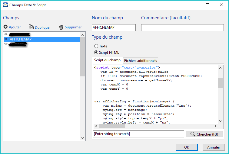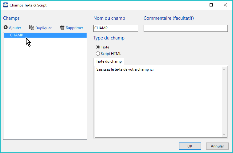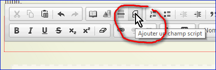 Vous recherchez votre script et cliquez sur "Insérer le champ sélectionné", et le nom sera reporté de la même manière dans votre paragraphe.