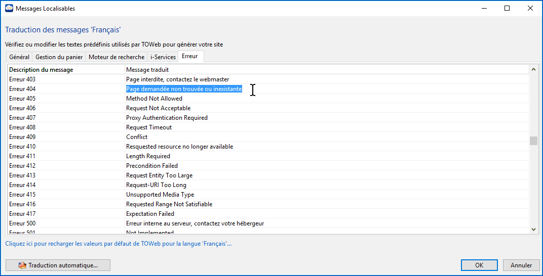 Dans cette page, vous allez pouvoir indiquer aux visiteurs le type d'erreur survenue sur votre site dans la langue de votre choix en cliquant sur "Modifier". Le visiteur sera dirigé vers une page spéciale de votre site plutôt que la page du navigateur.