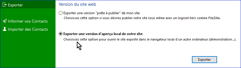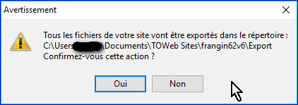 Vous pouvez exporter votre site dans un répertoire de votre disque dur si vous voulez le transférer sur votre hébergement avec un autre logiciel que TOWeb. Mais n'utilisez cette façon que si vous rencontrez des soucis à publier avec TOWeb qui est quand même le mieux adapté par sa simplicité.