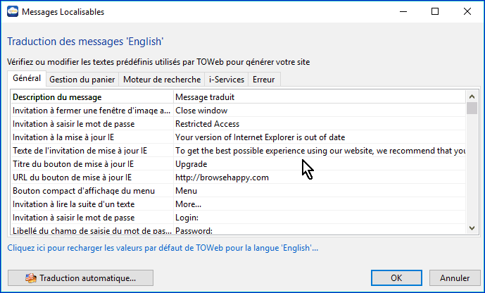 Cliquez sur le texte dans la colonne "Message traduit" pour effectuer la traduction manuelle.