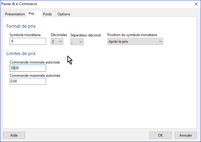 Comme pour le prix, laissez 0 dans les limites de poids si vous ne les utilisez pas.