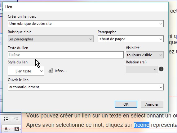 Vous pouvez créer un lien sur un texte en sélectionnant un ou plusieurs mots.