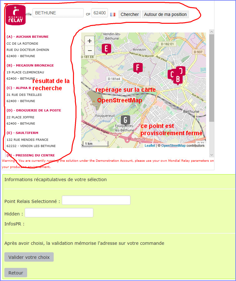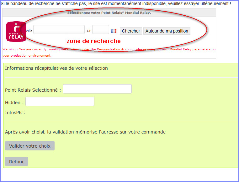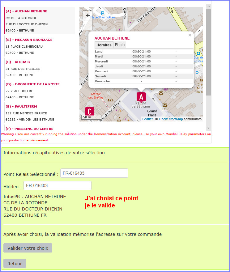 Le client pourra choisir son dépôt parmi les points officiels du site M R directement depuis votre site.