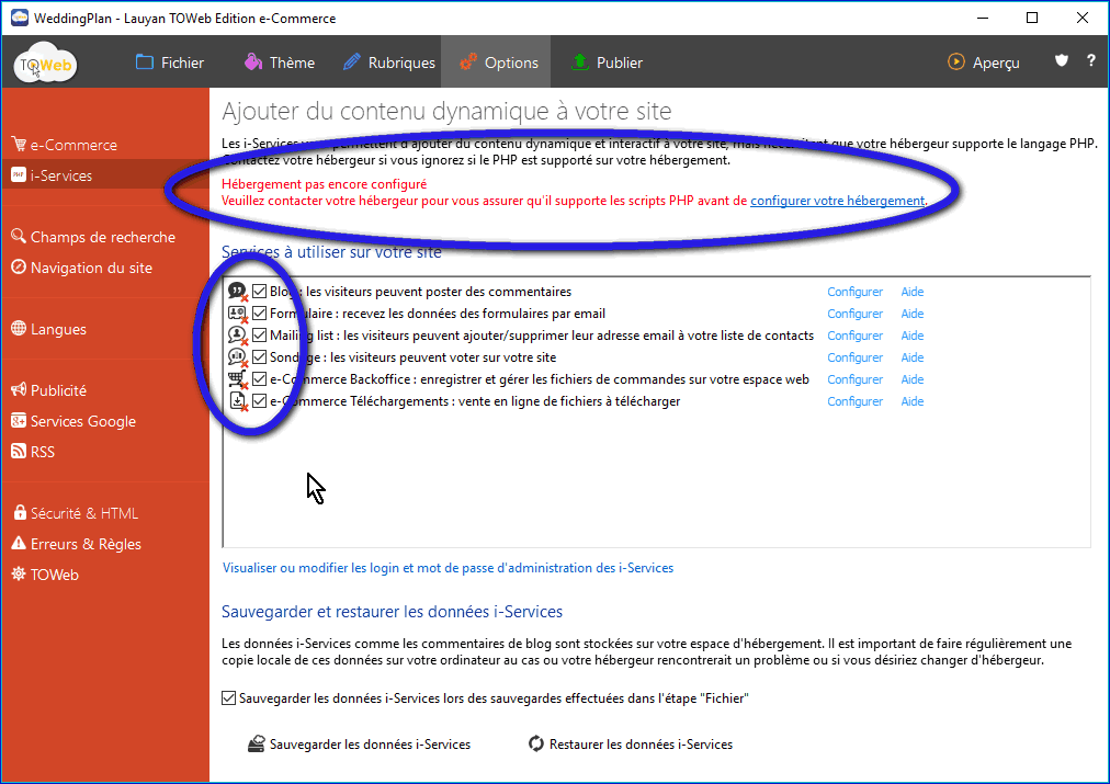 Sauvegarder et Restaurer les différents i-Services utilisés de ou vers votre h'ébergement.
