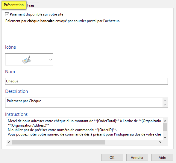 Pour le paiement par chèque, les préréglages effectuées par Lauyan suffisent généralement. Vous pouvez biensûr les modifier ou ajouter des zones de livraison si cela est nécessaire.