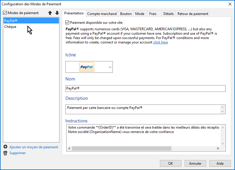 Dans la fenêtre principale, vous voyez la case "Paiement disponible sur votre site" qui sera sur tous les modes, cela permet de les invalider provisoirement sans perdre les données entrées dans les différents onglets, plutôt que les supprimer.