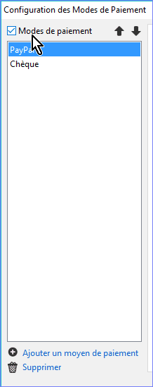 La partie commune dans laquelle vous retrouvez la validation générale des moyens de paiement (case Modes de paiement), la liste des paiements sélectionnables, la possibilité d'ajouter d'autres moyens ou d'en supprimer.