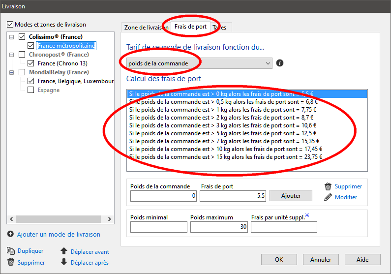 Sinon, dans le même onglet "Frais de port", vous choisissez cette fois "poids de la commande" pour le "Tarif". Vous créez ensuite votre grille en fonction des tarifs donnés par votre transporteur.