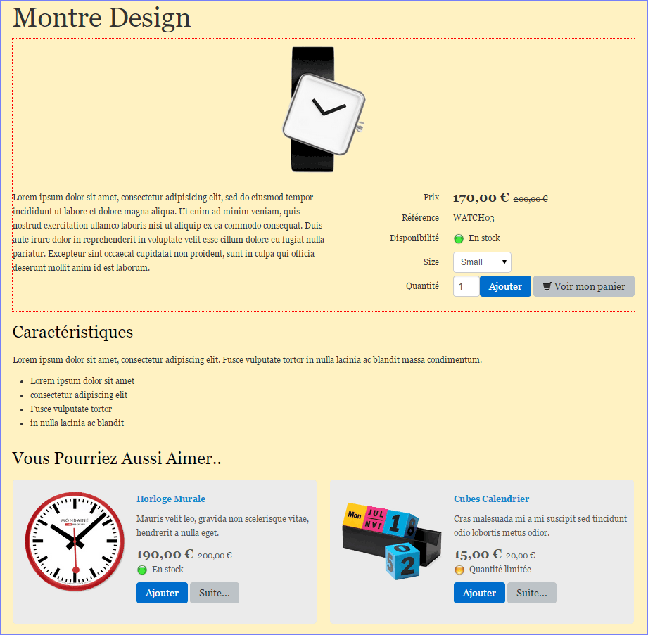Dans l'exemple, en affichant le produit 'Cubes Calendrier', lors de sa visite le client verra en bas de page les deux propositions sélectionnés (image 1).