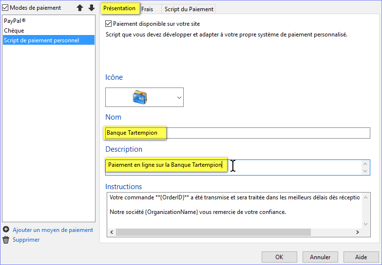 Dans la fenêtre d'ajout de paiement, sélectionnez "Scripts personnels" puis "Script de paiement personnel" et enfin "Ajouter"