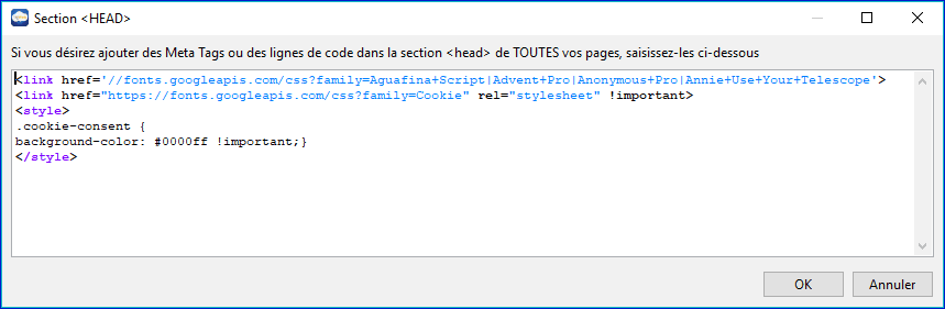 Après avoir cliqué, vous arrivez sur une fenêtre d'édition toute simple dans laquelle vous écrivez des petits scripts devant se trouver dans le haut du fichier .html (ou .php) mais non visible sur la page web,