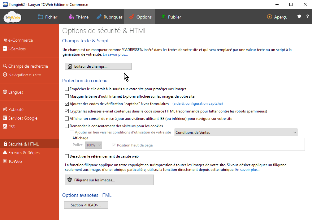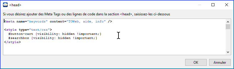 Vous pouvez ajouter également un script dans la Section <HEAD>, qui correspond à l'entête de toutes les pages du site. Ces scripts ne doivent pas contenir de texte à afficher mais uniquement des directives au fonctionnement de la page ou des renseigements vers les moteurs de recherche comme des balises Meta se rapportant au site en général. TOWeb utilise déjà cette section en interne pour indiquer par exemple le nom du site, du propriétaire si vous l'avez renseigné etc.