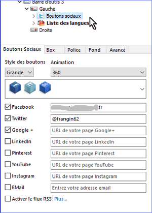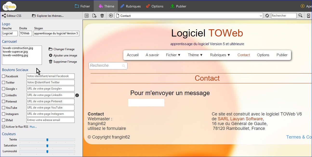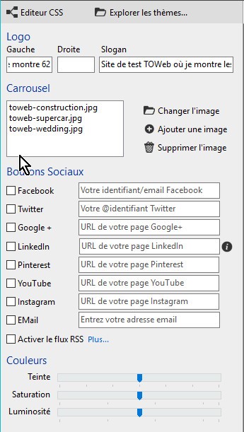 Cet éditeur est assez sobre et permet de modifier le logo, d'ajouter, modifier ou supprimer une image du carrousel et de sélectionner et renseigner les liens vers les réseaux sociaux.
